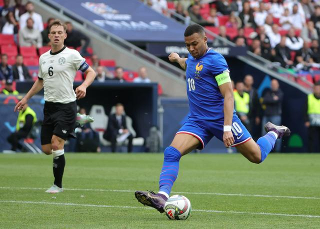 法国队球员姆巴佩(右)在比赛中射门。