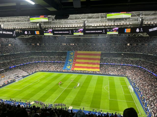 比赛开始前,为瓦伦西亚灾情的祈福也成为了伯纳乌球场的主题,伯纳乌南看台举起了“瓦伦西亚,我们与你同在”的标语,而在赛前默哀仪式上,伯纳乌看台也高举起了一面瓦伦西亚自治区的旗帜,皇马全队在赛前统一穿上了为瓦伦西亚自治区祈福的主题T恤,在突如其来的天灾面前,足球成为了将西班牙各地紧密连接在一起的纽带。值得一提的是,在欧冠主题曲奏响时,伯纳乌球迷集体发出了嘘声。