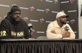 发布会期间奥尼尔吹牛说自己对现在这支热火很熟悉,韦德则调侃让他说出5个球员的名字,奥尼尔沉默了......